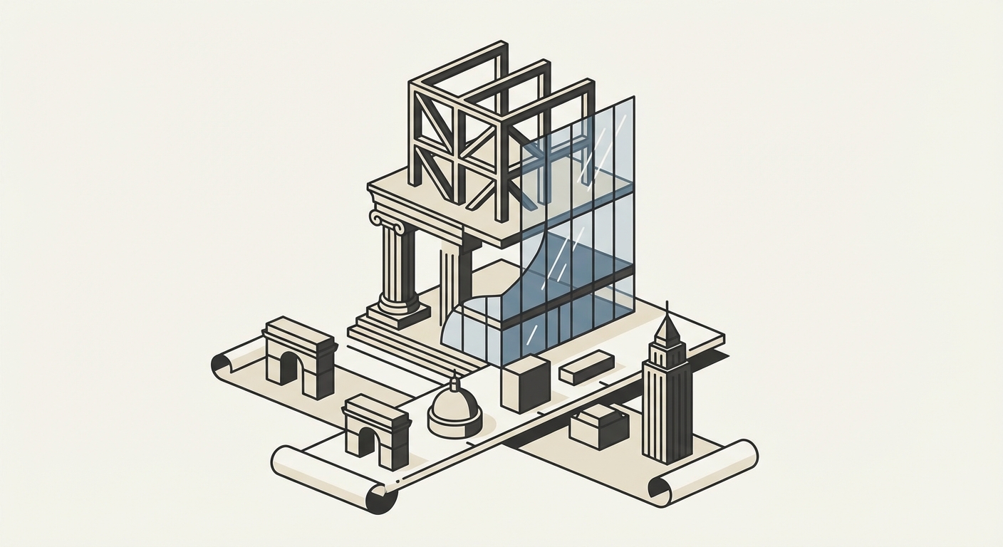 Buildings, architects, styles, structural design, landmark works, and architectural history.